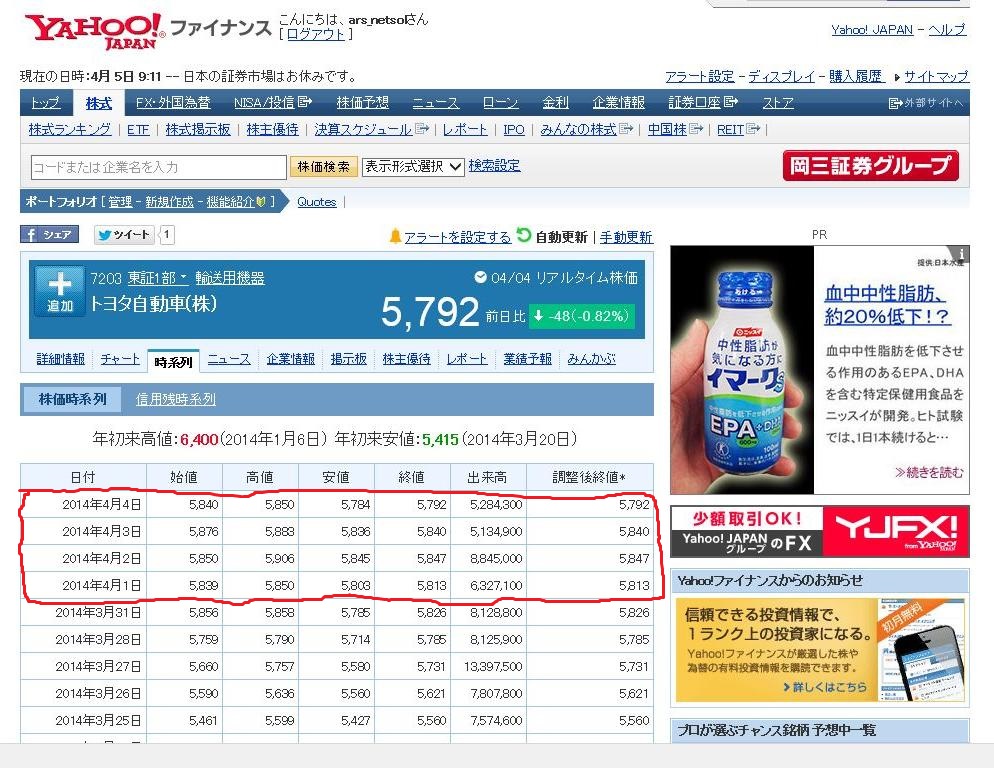 Yahooファイナンスの時系列データページ